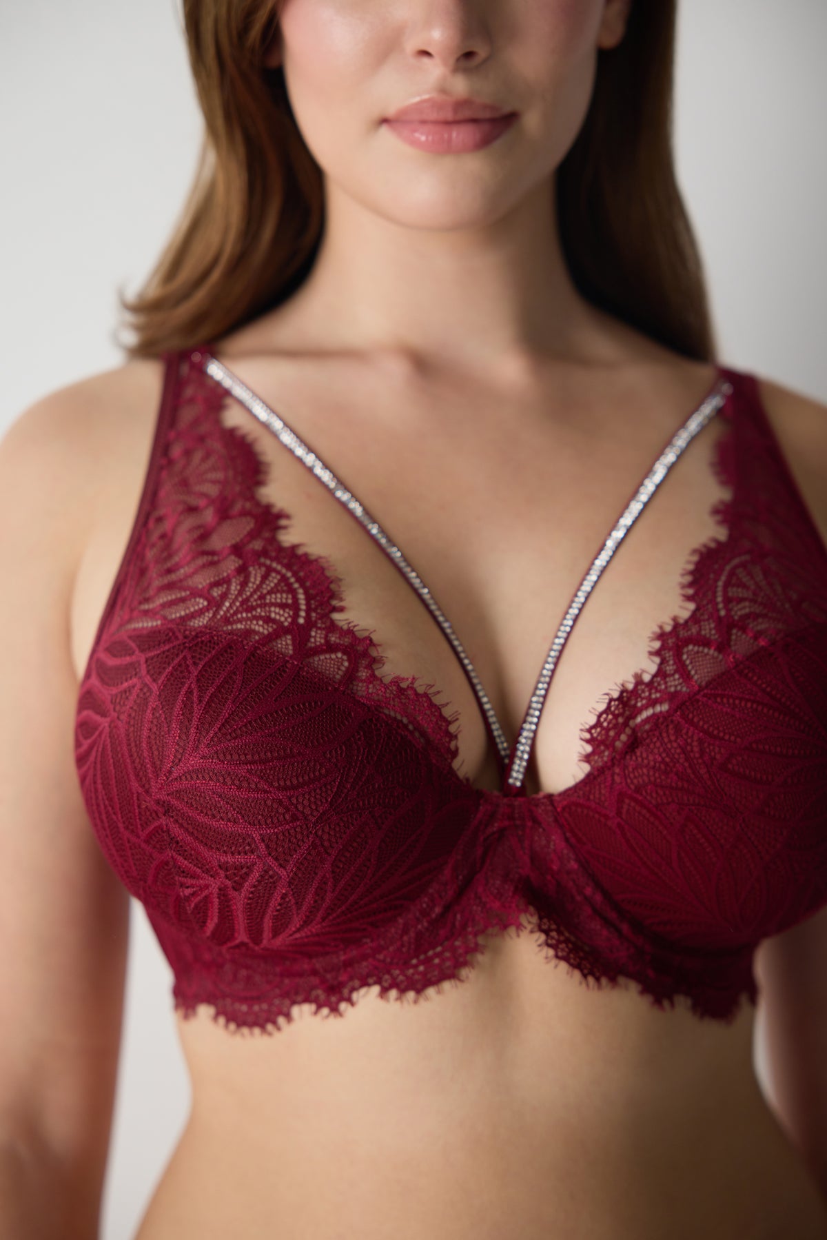 Bu sütyen, çapraz ipli yakası ile modern bir görünüm sunarken, üzerindeki parlak taş detaylarıyla ışıltı ve şıklığı bir araya getirir.