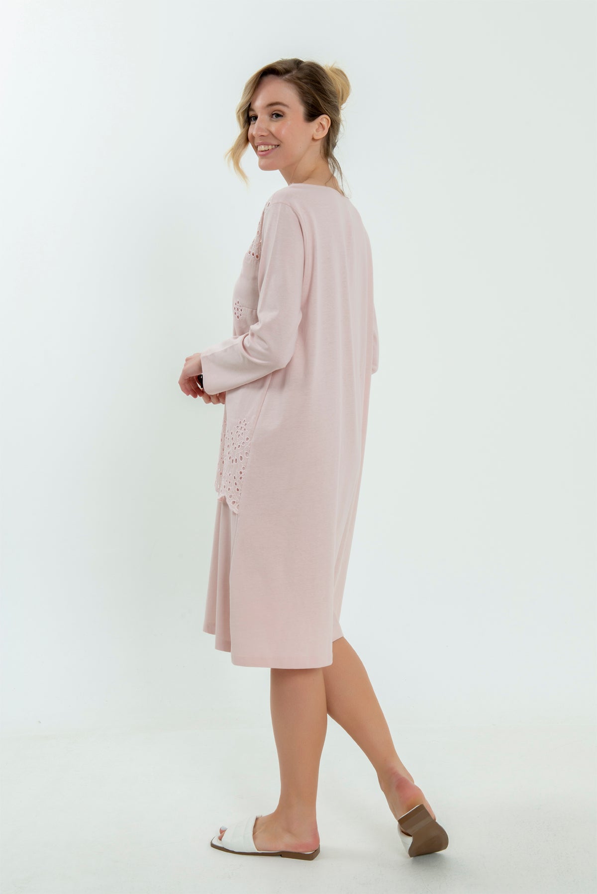 Brode Lace Combed Cotton Long Sleeve Short Women's Nightgown