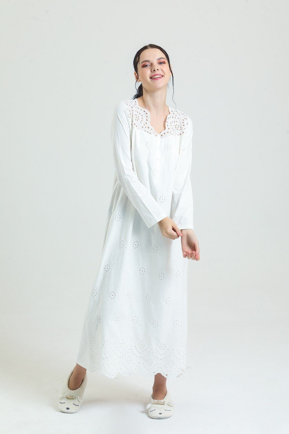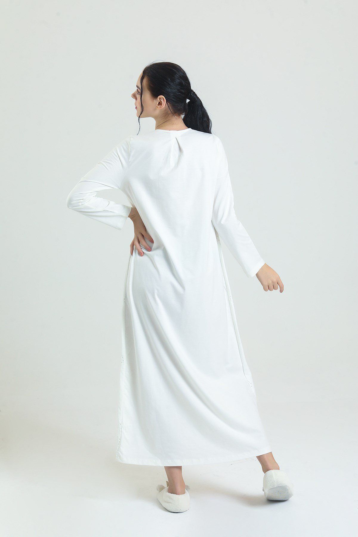 Front brode detail; Back and sleeves plain cotton fabric; Comfortable and comfortable design; Broderie Collar Buttoned Long Women's Nightgown is designed with details that highlight your elegance. The nightgown, which adds movement with an elegant brode detail on the front, offers a simple and comfortable look with its plain cotton fabric cut on the back and sleeves. Its minimalist design brings elegance and chic together, making your night special. This nightgown adds a different touch to nightwear with its comfortable fabric and stylish details. This suit, which completes both your night and morning style with its buttoned front design, is also specially designed for pregnant, postpartum and breastfeeding mothers. Fabric Content: 100% Cotton