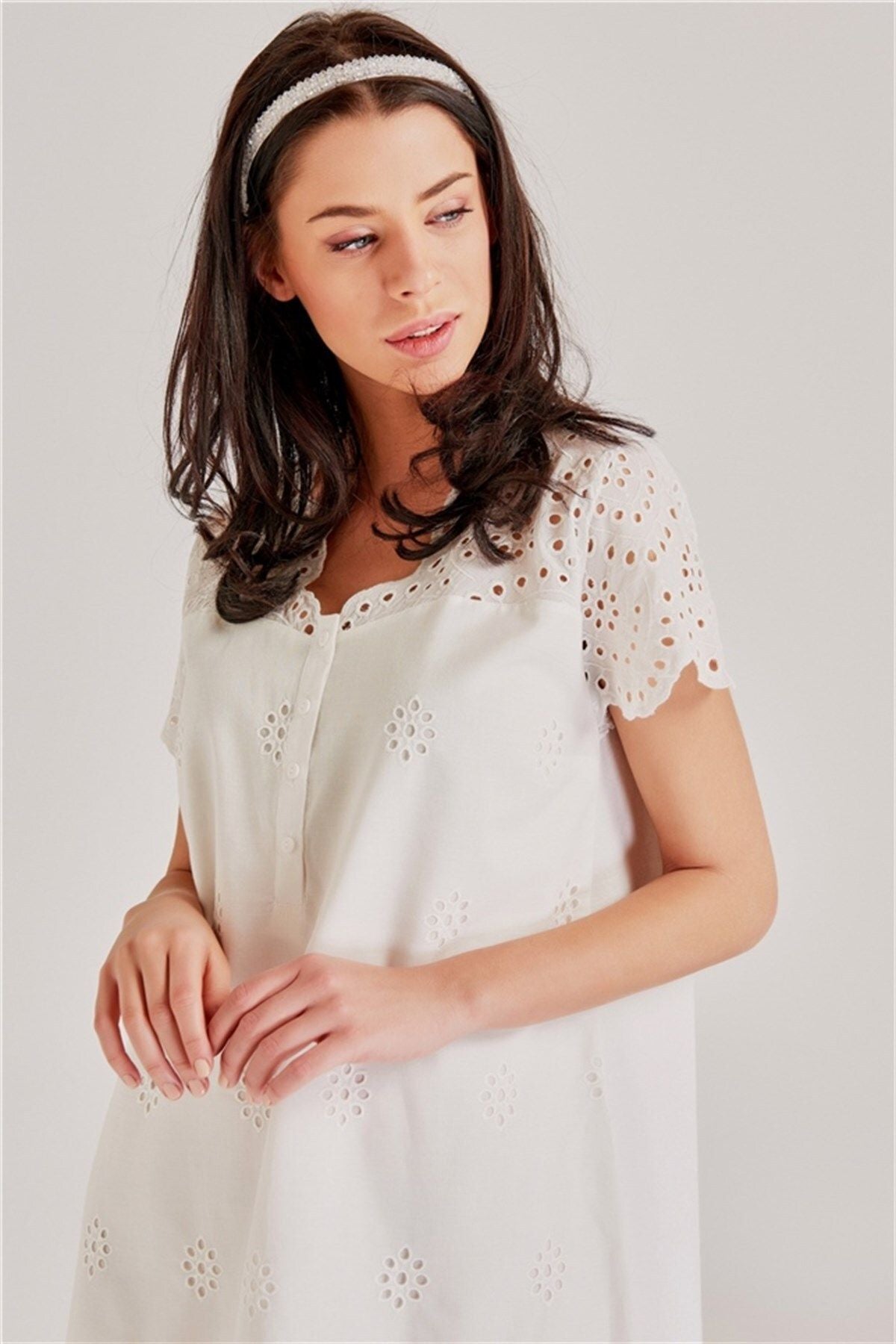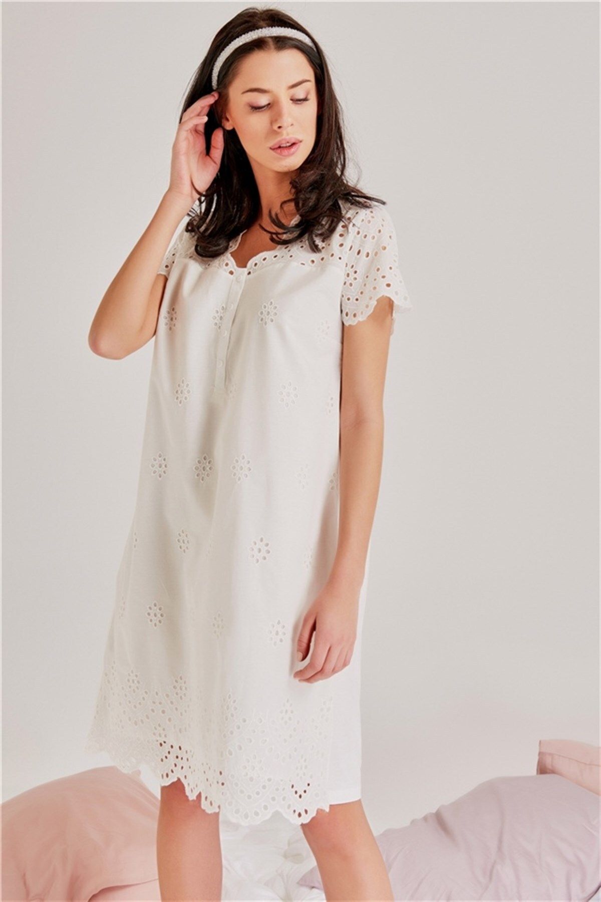 Thanks to its woven fabric structure, it has increased durability and offers long-term use by preserving its form; - It adapts to your body lines with its standard length and provides a comfortable sleeping experience; - Its short-sleeved design does not restrict your freedom of movement while keeping you warm even on cool nights; - It adds an elegant touch to your special moments during pregnancy and postpartum while providing a stylish and feminine look with its self-embroidered patterned structure; - You can preserve the form of your product by following the delicate washing instructions by turning it inside out at 30°C in the washing machine;