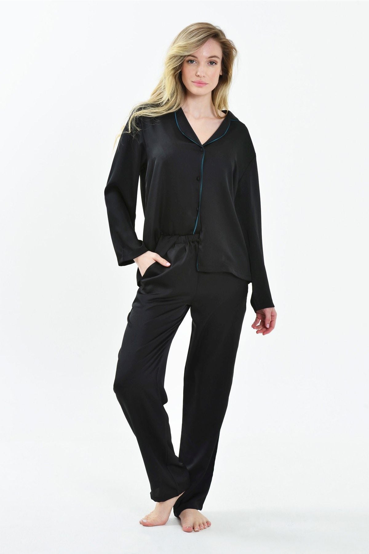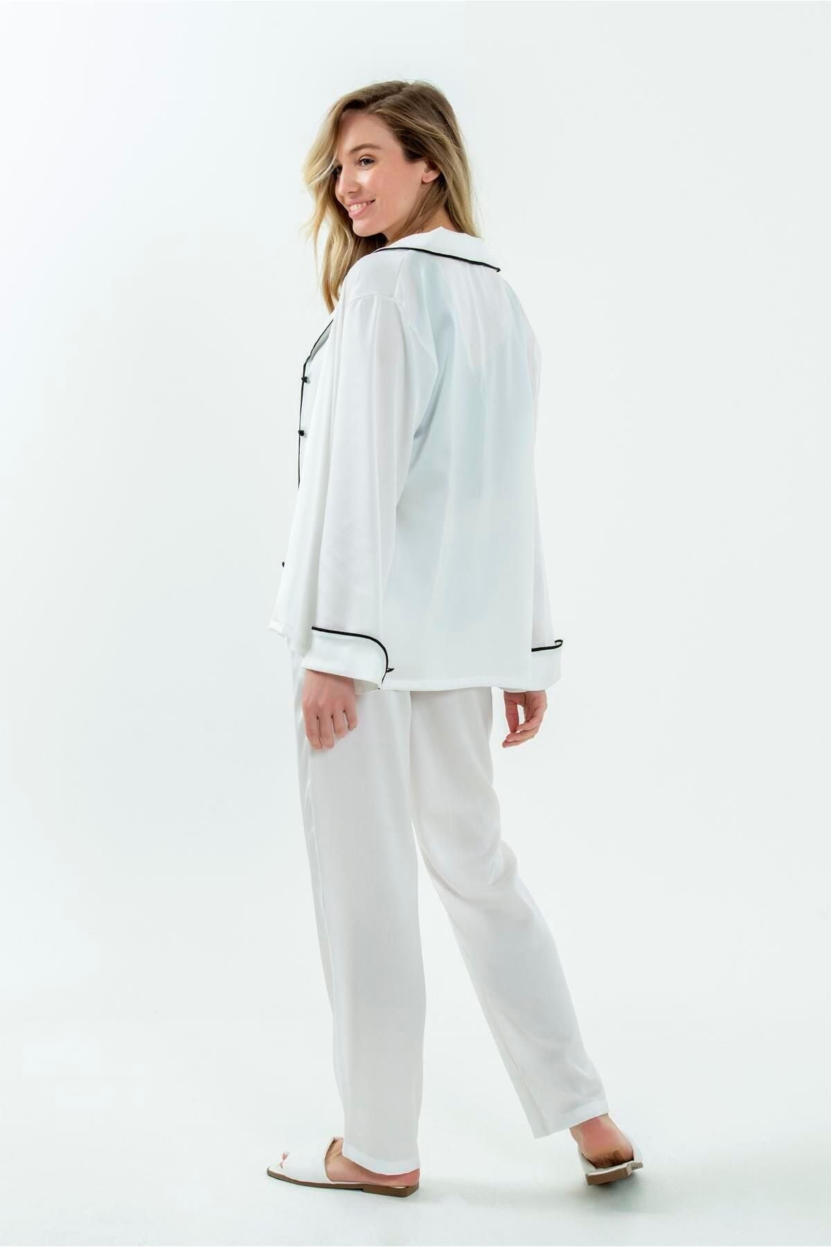 Satin piping pajamas combine classic satin elegance with modern piping details. Elegant and comfortable, these pajamas are a perfect option for special nights.