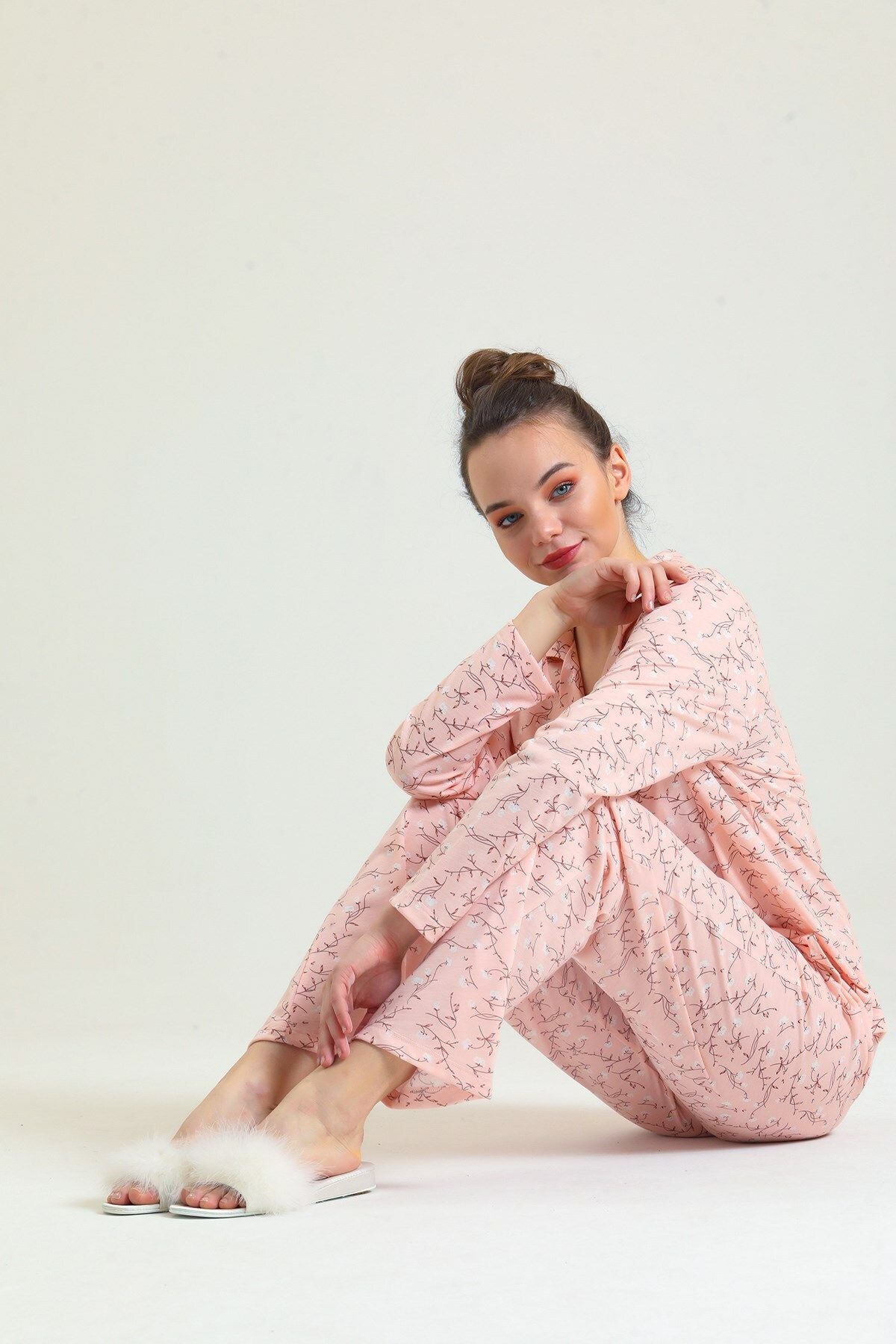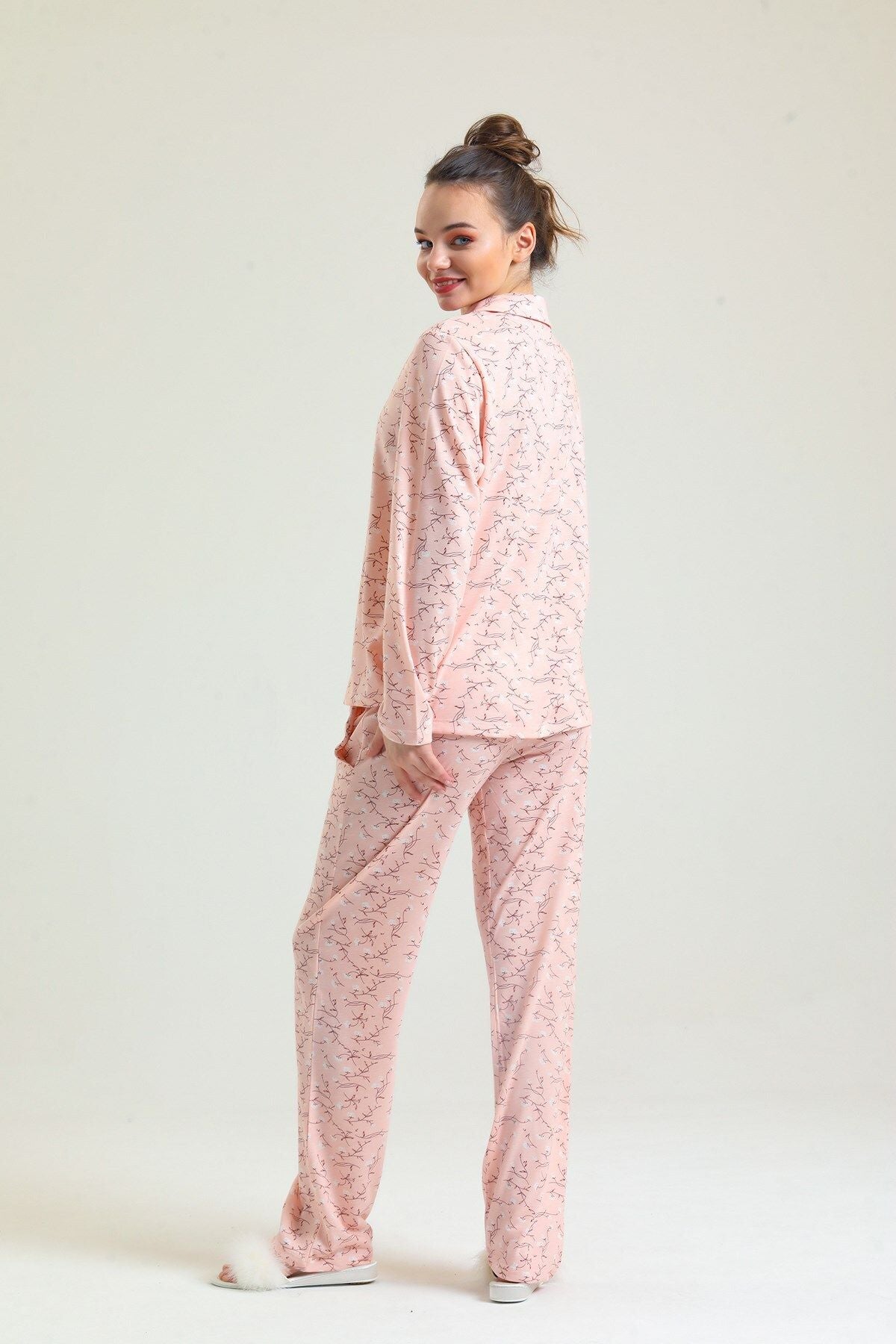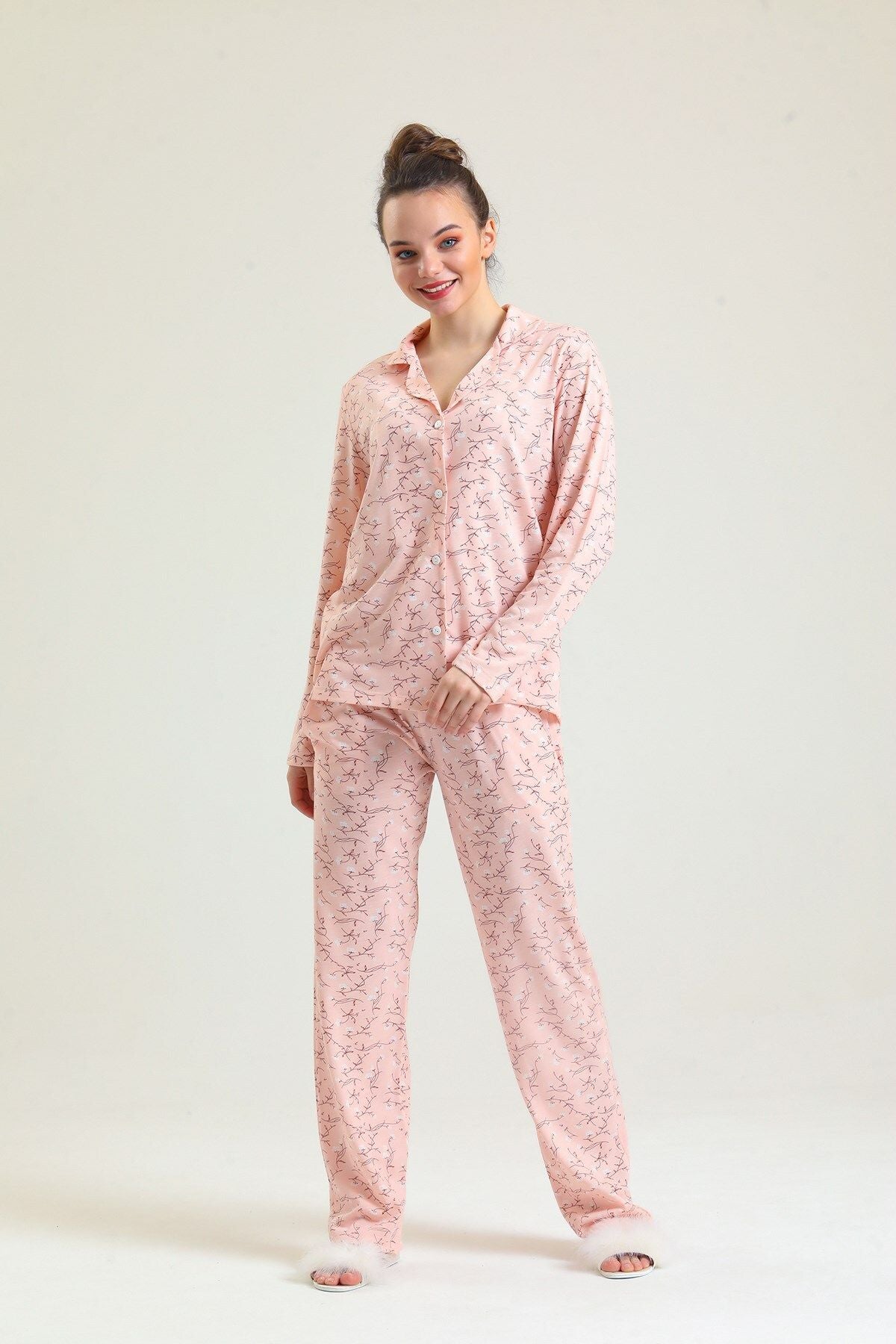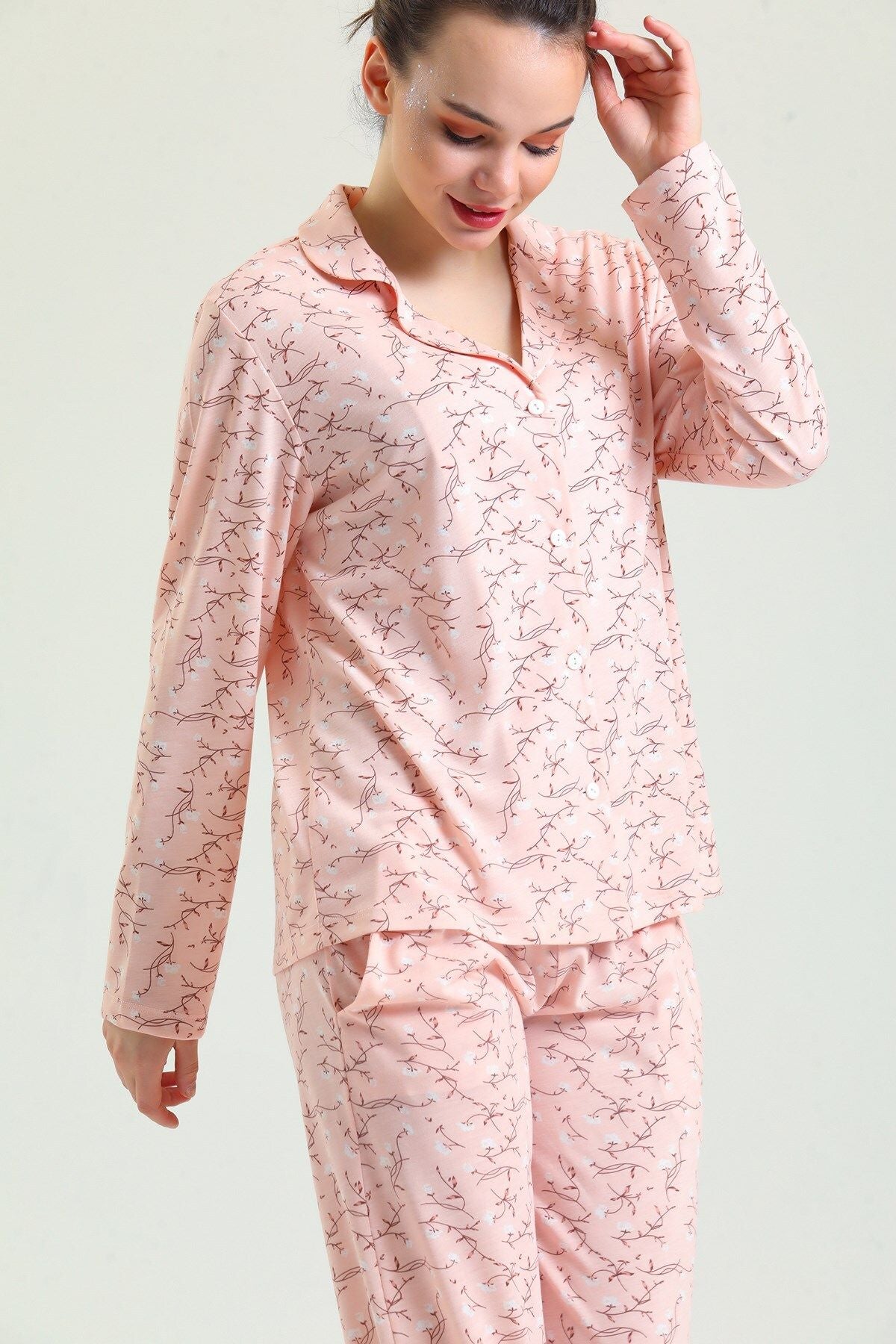 Cotton embroidered long-sleeved pajamas stand out with their natural cotton texture and elegant embroidered details. Thanks to their soft and breathable fabric, they keep you comfortable throughout the night. They are an ideal option for cold nights.