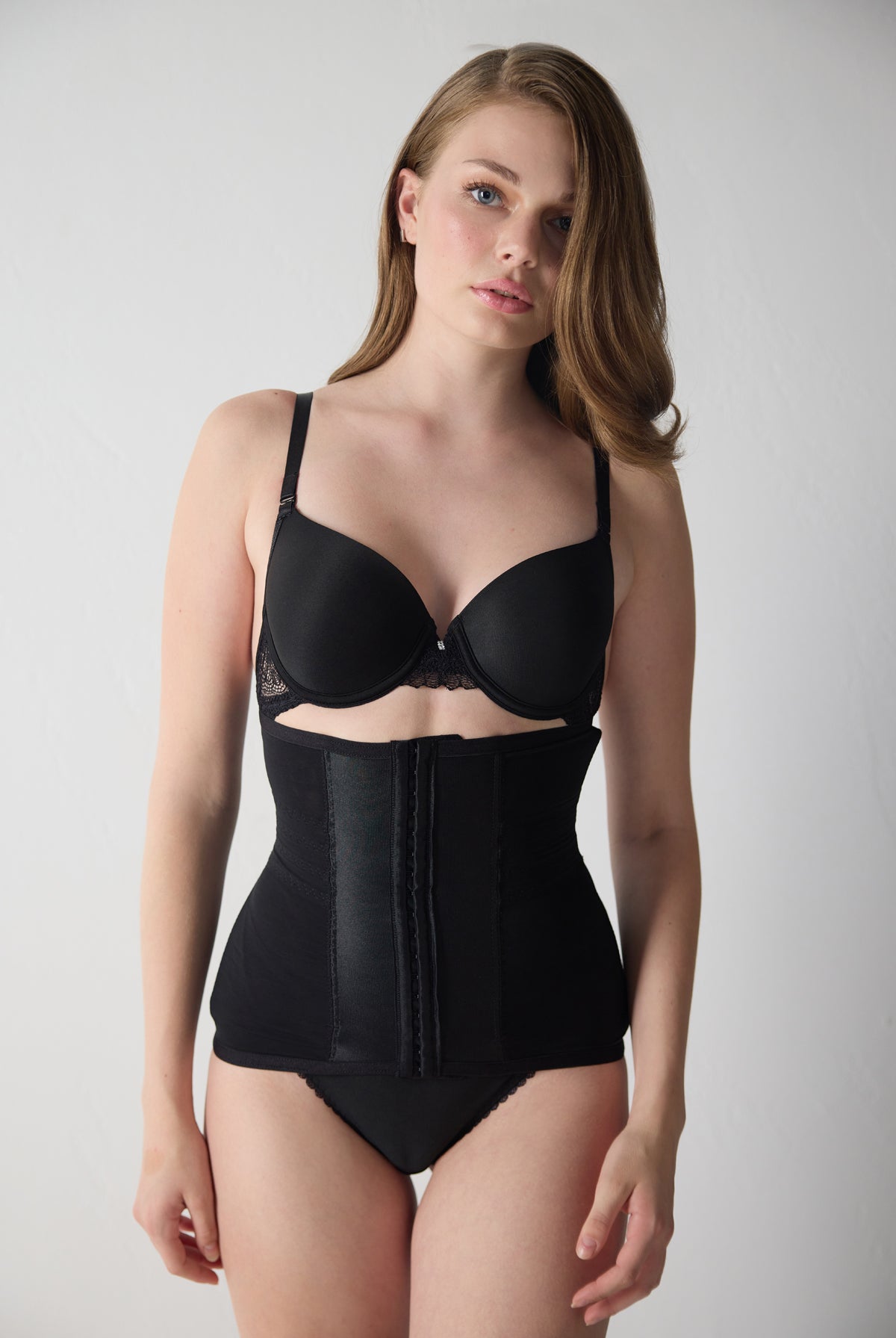 This slip corset, which starts from under the bust and wraps tightly to the waist area, can be easily put on and taken off with its snap-fastening structure. It is a practical option that goes well with any outfit.