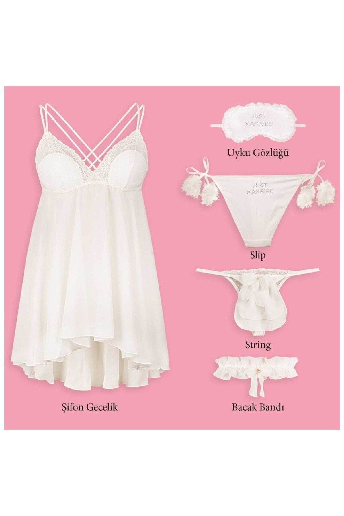 1 chiffon nightgown; 1 "Just Married" written sleep glasses; 1 "Just Married" written slip panties; 1 flounced front string panties; 1 leg band; This dowry set, designed to make your honeymoon excitement even more special, brings romance and elegance together. The chiffon nightgown in the set offers a comfortable sleeping experience with its elegant and light texture, while the Just Married written sleep glasses add a romantic touch. In addition, you can make your honeymoon days even more special with Just Married written slip panties and flounced front string panties. The leg band completes your elegance as a complement to the set. This special set was designed to make you experience unforgettable moments during your honeymoon. Fabric Content: 81% Polyamide 17% Elastane 2% Cotton